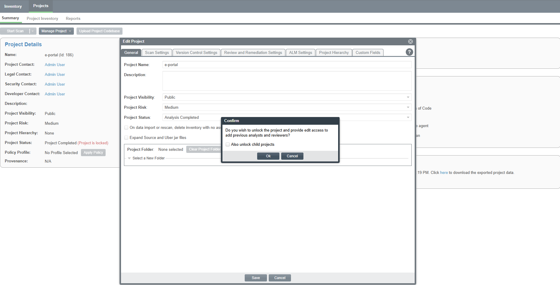 Additionally, Code Insight also allows you to unlock the same project—and its associated child projects, if applicable. To unlock a project, change the Project Completed status to a different required status for the Project Status field in the General tab on the Edit Project window. This action also displays the Confirm dialog box, which allows you to confirm the unlocking action and to optionally include the associated child projects in the unlocking process. Selecting the check box labeled Also unlock child projects in this dialog box allows you to unlock all associated child projects along with the parent project.