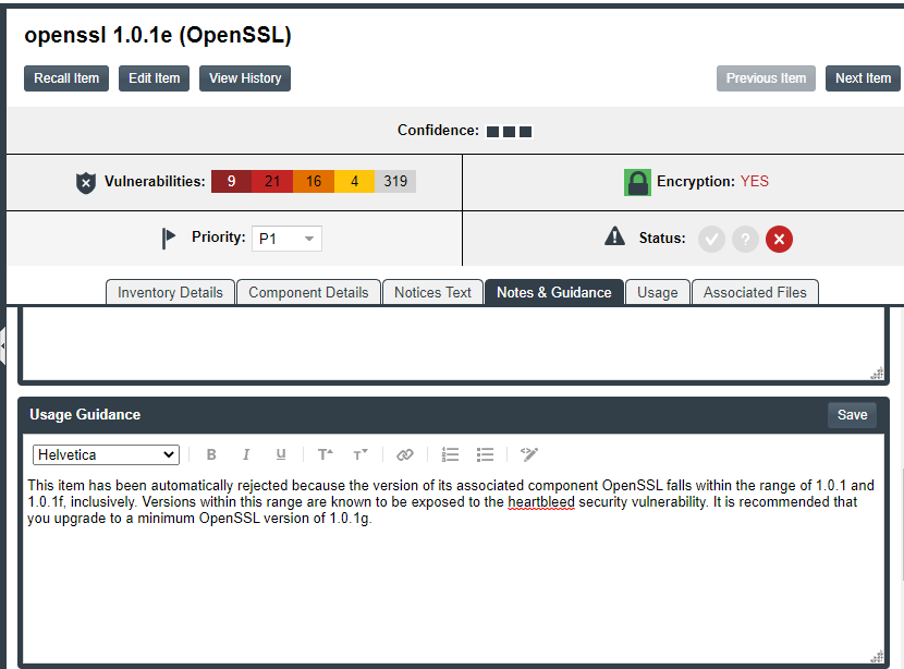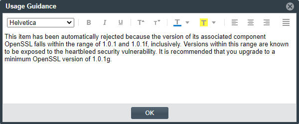 When an inventory item is rejected because its component and version meet the criteria of this policy, the Usage Guidance pane on the Notes & Guidance tab for this inventory item shows your explanation.