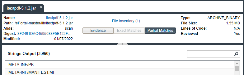 In the content of a given binary file (such as an object file, image, executable, and so forth) in the codebase, Code Insight can locate textual strings that might be evidence of open-source or other third-party code. Each string, consisting of at least three consecutive printable characters, might part of a comment, copyright, URL, email address, and another evidence type. Code Insight simply lists these strings on the Partial Matches tab; it does not show them highlighted within the context of the actual binary code (unlike non-binary files, in which Code Insight highlights evidence within the actual file content).
