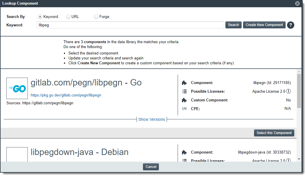 8. In the list of search results in the Lookup Component window, scroll to the appropriate component section, and click Show Versions ( or Show Instances) to display the list of instances (version-and-license combinations) for that component.