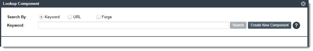 6. To search for a component, select the type of search you want to perform (Keyword, URL, or Forge), and enter the required search criteria. For information on these searches and the criteria you must enter for each, see Guidelines for Lookup Component Searches.